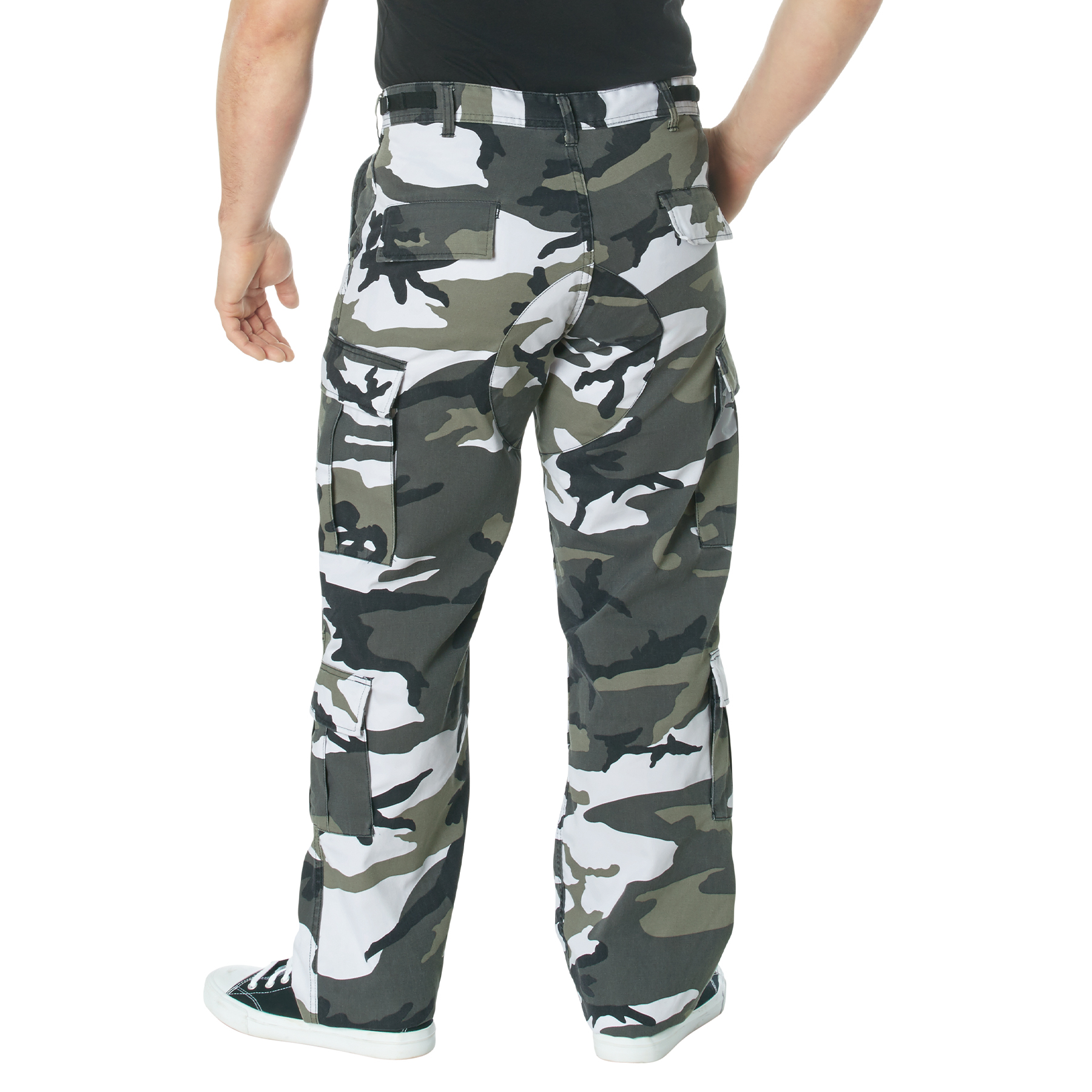 Rothco Cargo Pantalone paratrooper maskirne cargo pantalone za muškarce, ravan kroj i nogavice, sa osam džepova i ojačanjima na kolenima i zadnjici. Materijal 55% pamuk/45% poliester, jezičak za zatezanje struka; za teren i svakodnevno, proleće–jesen, pogodne i kao vojne pantalone.