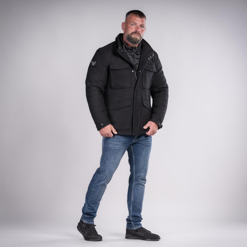 Jakna-kaput Thor Steinar Lodiken zimska muška jakna od pamuka, punjena poliesterom, sa velikom kapuljačom i postavljenim džepovima. Crna boja i ravan kroj za svakodnevnu upotrebu u hladnim zimskim danima; praktična parka za grad i put.