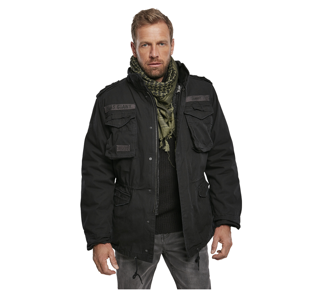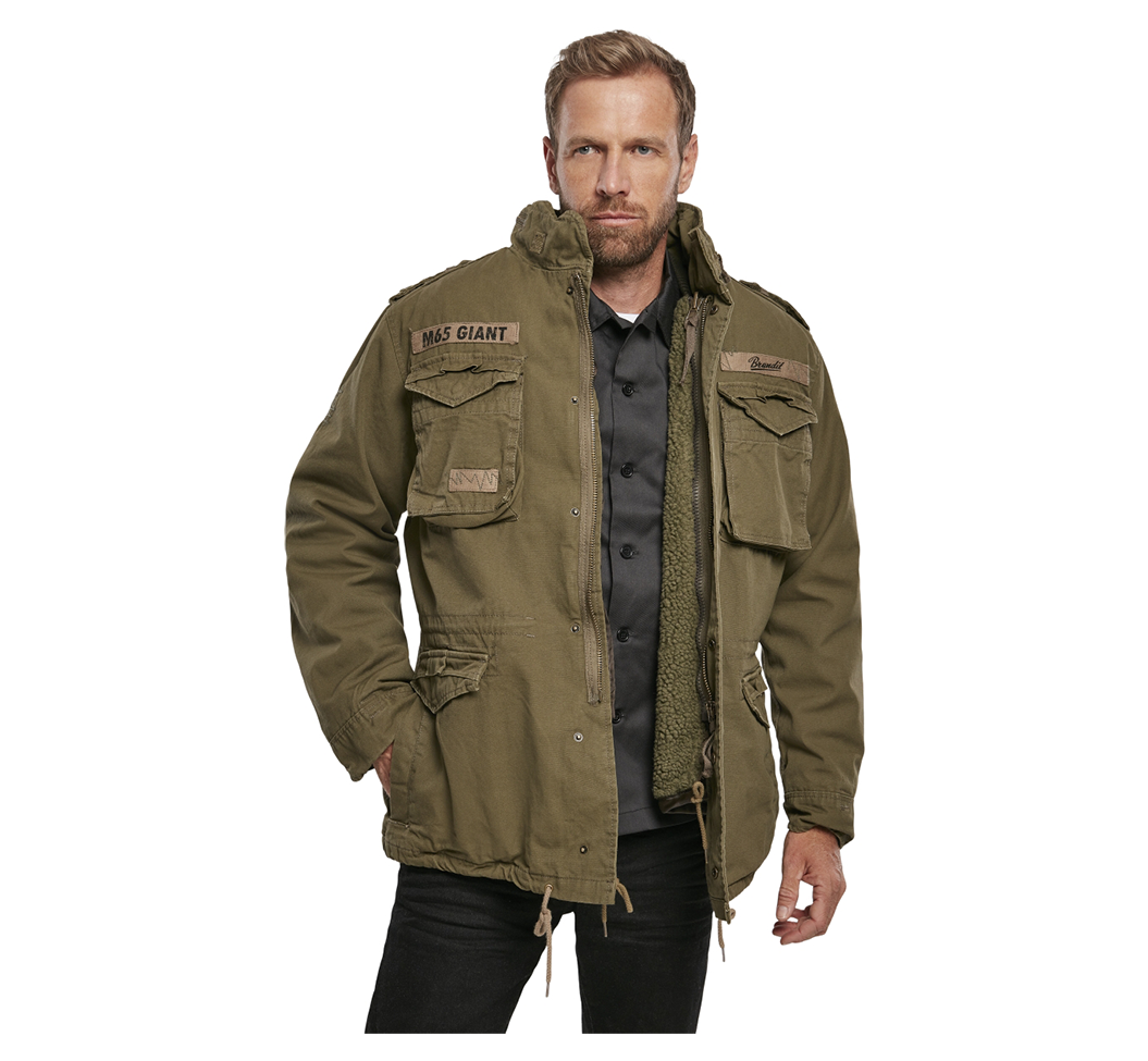 Jakna M65 Giant Brandit vojna jakna od ispranog pamuka s debelim poliesterskim uloškom u modernom kroju, s podesivim strukom i rukavima. Ima skidivu kapuljaču u kragni i umetak koji se može skinuti; pogodna za jesen i zimu i svakodnevno nošenje.