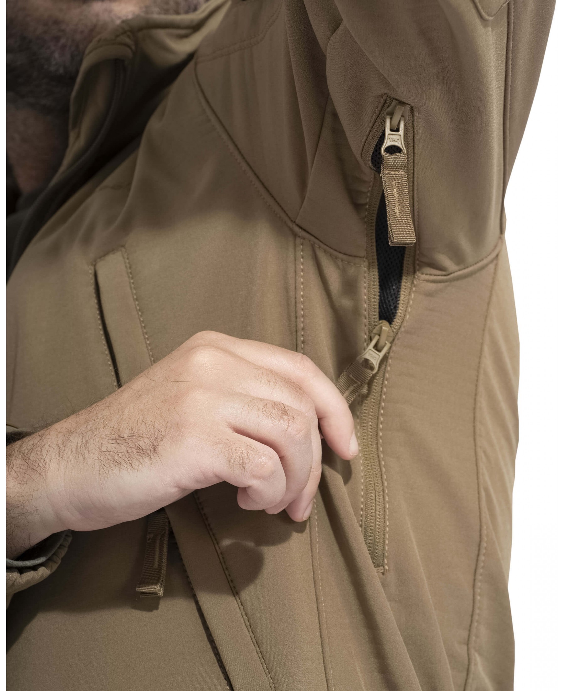 - Spoljašnjost je izrađena od elastičnog softshell materijala koji pruža dobru vetrootpornost, omogućavajući slobodu pokreta i zaštitu od promaje.