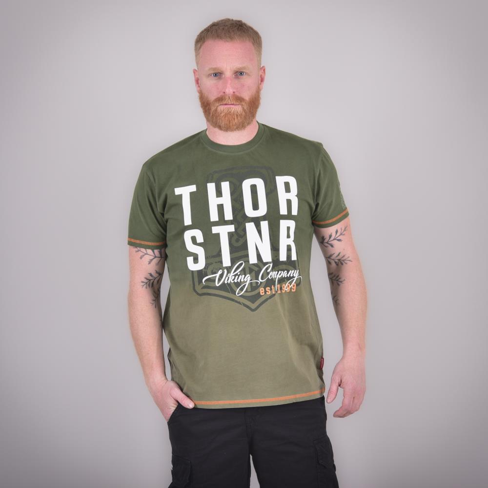 Majica Hammer by Thor Steinar – majica od 100% pamuka, klasičnog kroja i kratkih rukava, u maslinastoj boji. Pamučna majica je prijatna za kožu i namenjena svakodnevnom nošenju u toplijim danima, pogodna za proleće i leto.