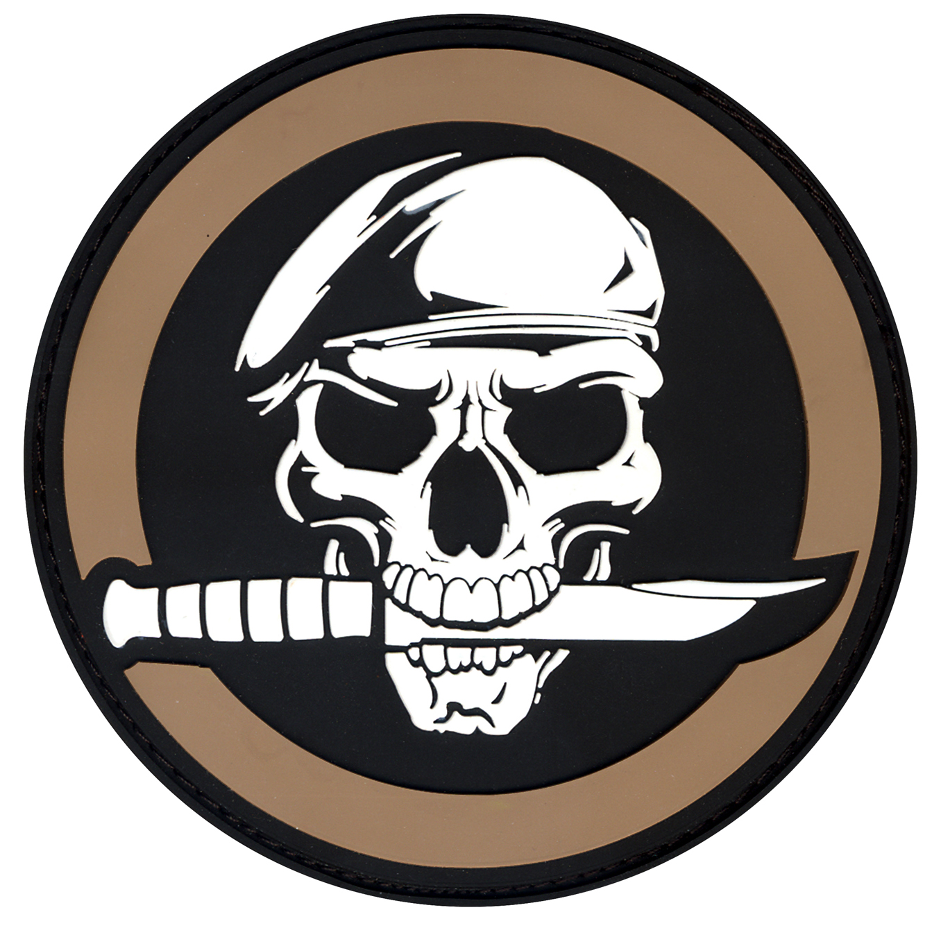 - Motiv lobanje sa nožem, simboličan za taktičku opremu