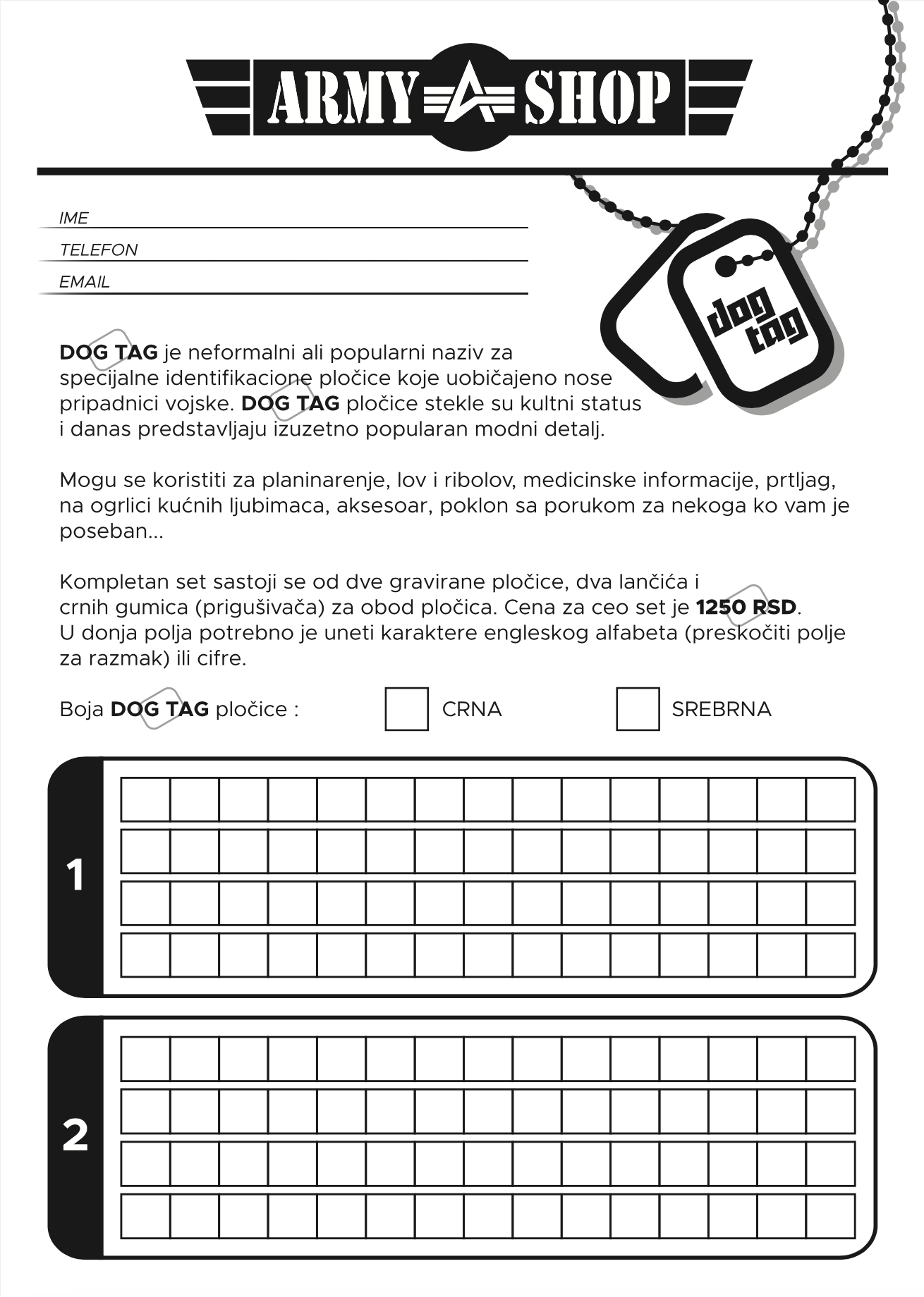 Rothco Dog Tags pločice sa utiskivanjem slova – personalizovana izrada dog tags, odnosno vojne pločice, su metalne identifikacione pločice od nerđajućeg čelika u srebrnoj boji sa crnim gumicama.