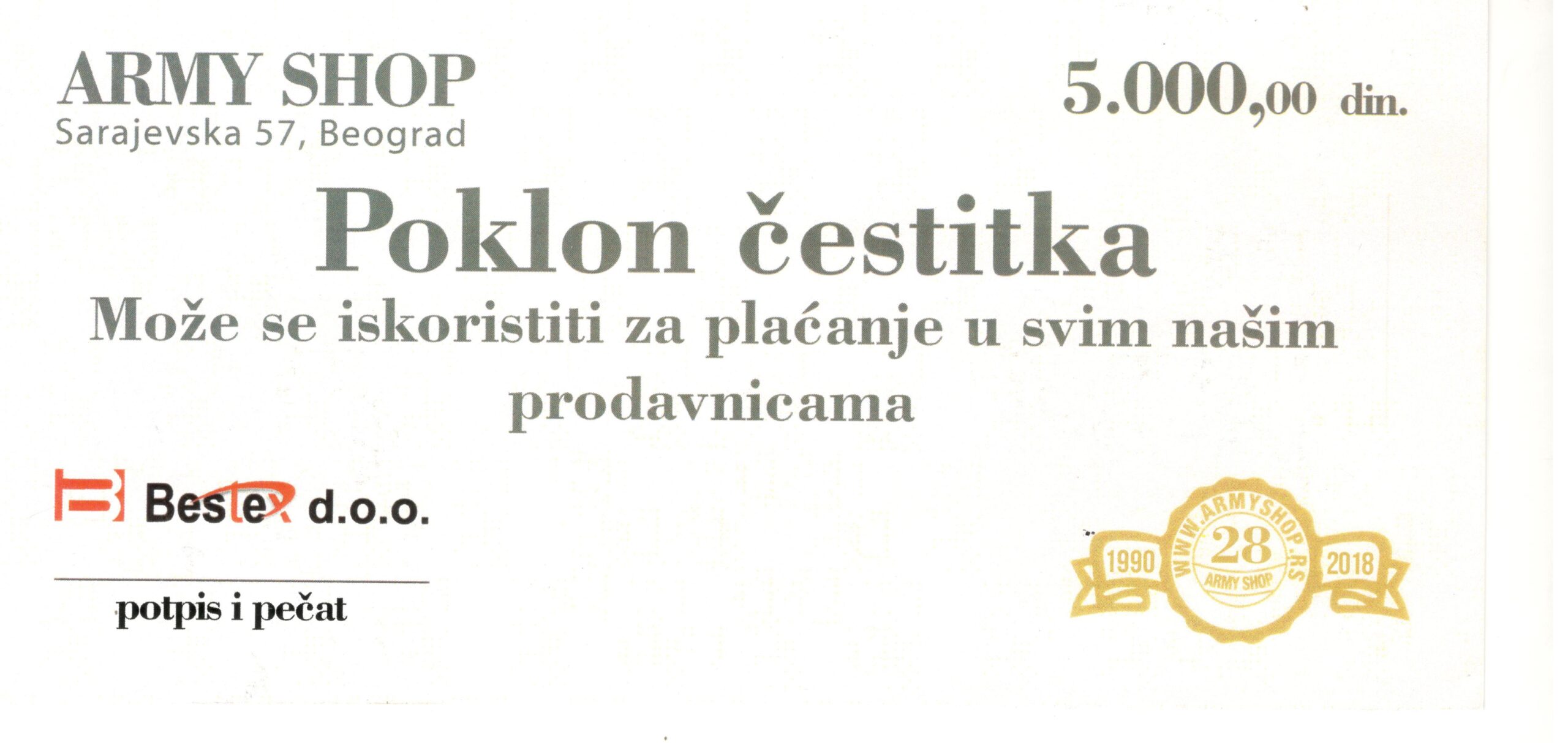 Poklon čestitka 5.000 dinara Army Shop poklon čestitka (vaučer) za kupovinu u radnjama i online, pogodna za izbor među aksesoarima i opremom. Važi tokom cele godine i pogodan za različite prilike.