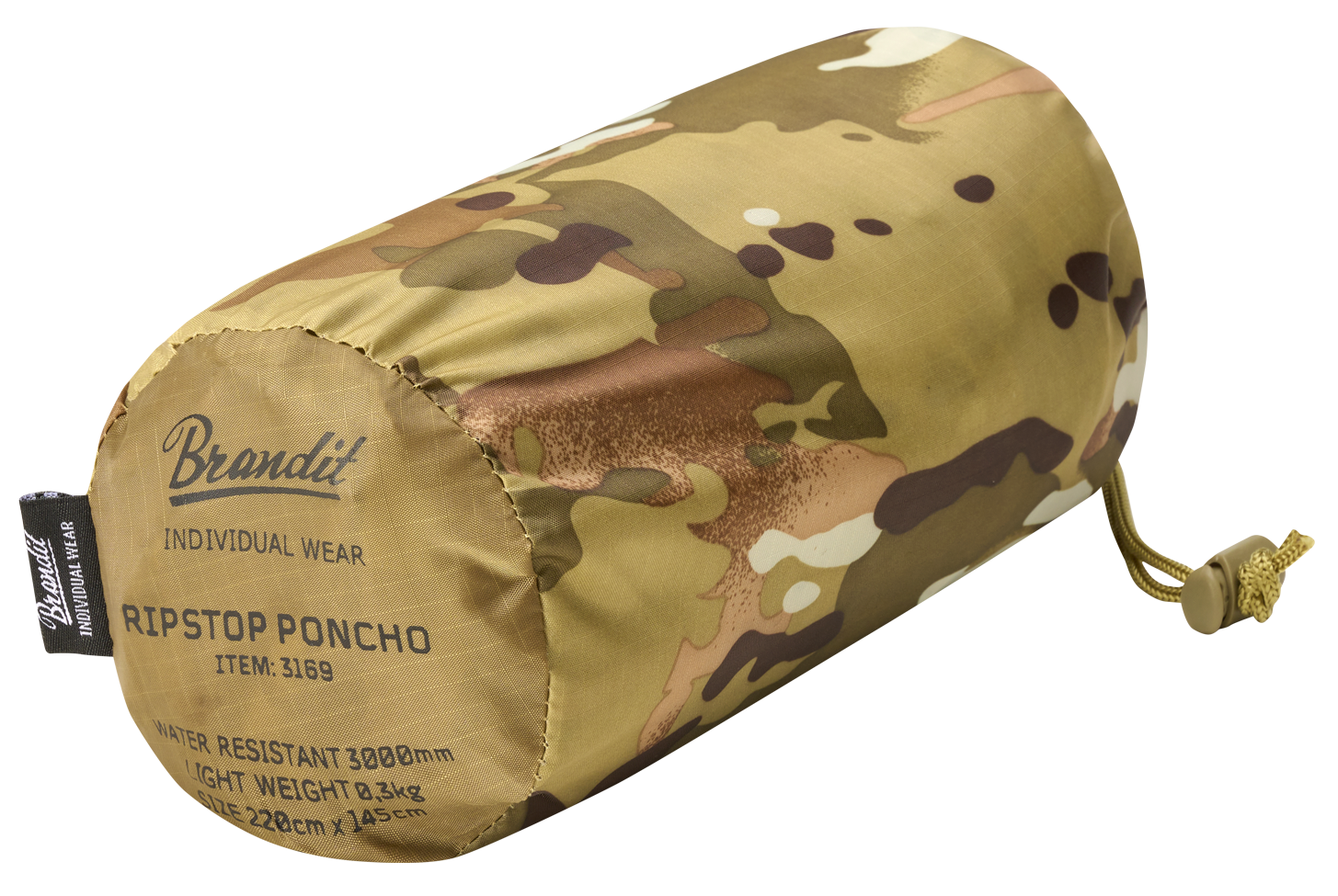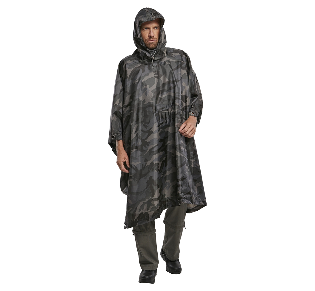 Brandit Ripstop Poncho/kabanica pončo je od lagane ripstop tkanine sa uniseks krojem. Prostran dizajn ide preko slojeva i opreme, namenjen za kišne dane u proleće i jesen, pogodan za planinarenje i grad; dostupno u Dark Camo i Tactical Camo.