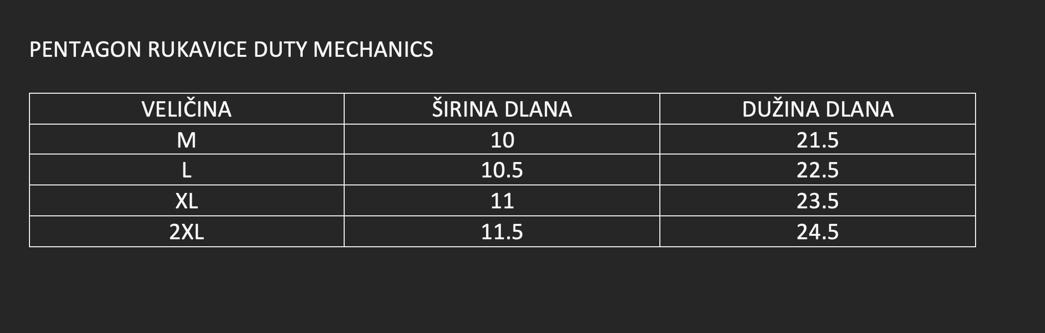 Taktičke Rukavice Pentagon Duty Mechanic mehaničarske rukavice su napravljene od izdržljivih sintetičkih materijala sa ojačanjima na dlanovima i prilagodljivim zatezačem, pružajući dobro pristajanje za rad u svim uslovima. Namenjene su za teren i radionicu, tokom cele godine.