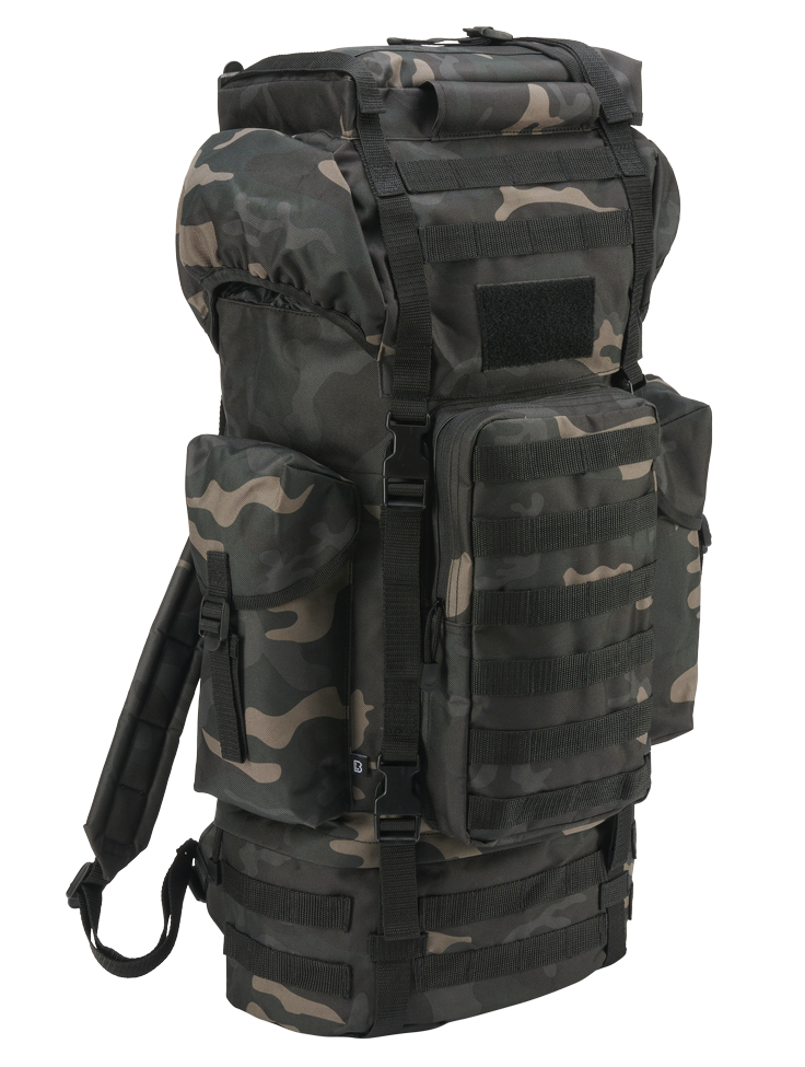 Veći ranac Brandit Combat MOLLE 65L ruksak izrađen od izdržljive tkanine, sa MOLLE sistemom i više pregrada, namenjen je za planinarenje, kampovanje i duža putovanja. Podesive naramenice, grudni remen i pojas za kukove nude stabilnost tokom cele godine; boje: Crna i Dark Camo.