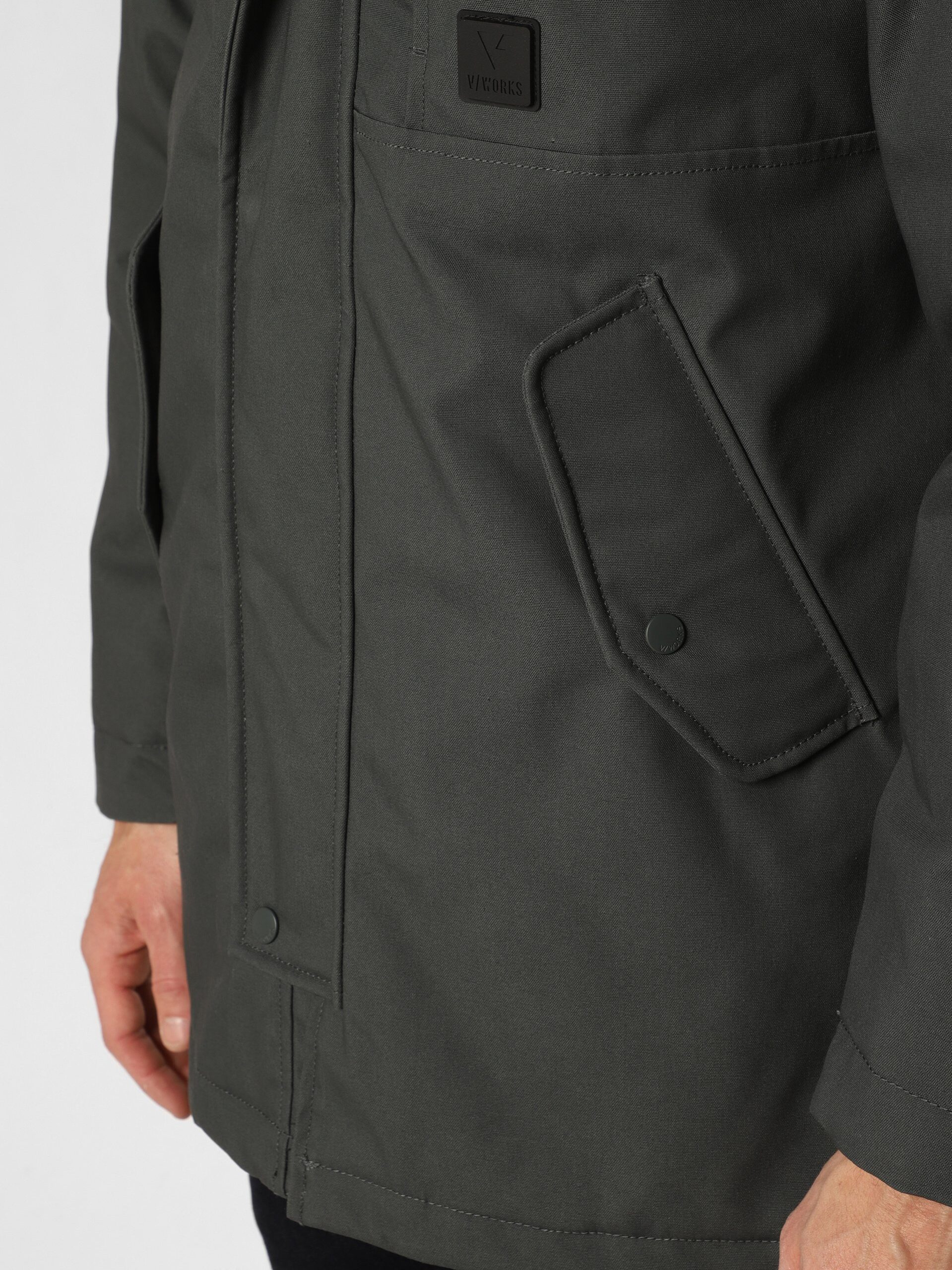 Vodooptorna Parka Gus Vintage Industries parka sa produženim krojem izrađena je od platna 65% poliester/35% pamuk, sa recikliranom poliesterskom postavom i vodootpornošću 3000 mm. Namenjena je za jesen i zimu, za grad i prirodu, pogodna kao zimska jakna.